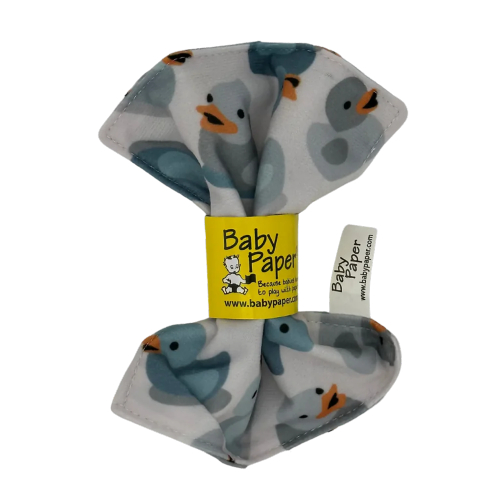 Baby Paper is unique and uniquely simple and babies love it! Baby Paper makes a crinkly paper sound when handled or even just touched by babies. Babies just can't keep from grabbing, chewing, crinkling and crunching this 6x6" sheet of "material paper." It is small enough for the tiniest of hands to grasp. Baby Paper is made of soft material and is machine or hand washable (tumble dry low or air dry). A perfect first baby toy. 6" x 6". Baby Paper - Duckies is shown.