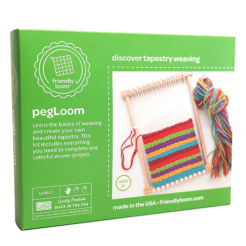 The Harrisville Designs PegLoom for Beginners is a great way to discover the excitement of real weaving. This 7x10" hardwood loom will let your aspiring weaver experience the satisfaction that comes with creating a real woven project! The PegLoom allows you to discover the basic techniques of weaving by moving the threaded needle over and under the warp strings. Pure wool yarn, cotton warp string and plastic needle are included, adding creativity, concentration, and pattern recognition into their first project. The sturdy wooden loom is designed with slanted pegs so weaving won't fall off, for success every time. PegLoom kit includes everything needed for a complet woven project up to 5.5" x 9". Award Winner. Made in USA.