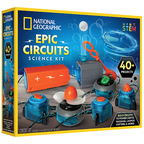 Introduce curious kiddos to the wonders of electricity with the National Geographic Epic Circuits Science Kit! With over 40 safe projects and activities that don't require any tools, this STEM set keeps kids occupied for hours as they learn how circuits work. They'll follow simple instructions to learn the basics with different types of switches to power lights and operate a fan, then move to more advanced projects to levitate a ball, blow bubbles, launch a copter, and much more! Requires 3 AAA batteries, not included.