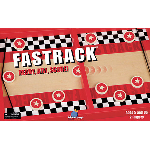 Get ready, aim and score with Fastrack - a game for family fun! With Fastrack, the action is non-stop. Using the elastic cord to propel the disks, be quick and aim the wooden disks through the gate. Be the first to send all 10 disks zooming across to the other side to win. Simple to play but difficult to stop playing. Contents include 1 wooden track, 10 wooden disks and illustrated rules. For 2 players. Game play is approx. 10 minutes.